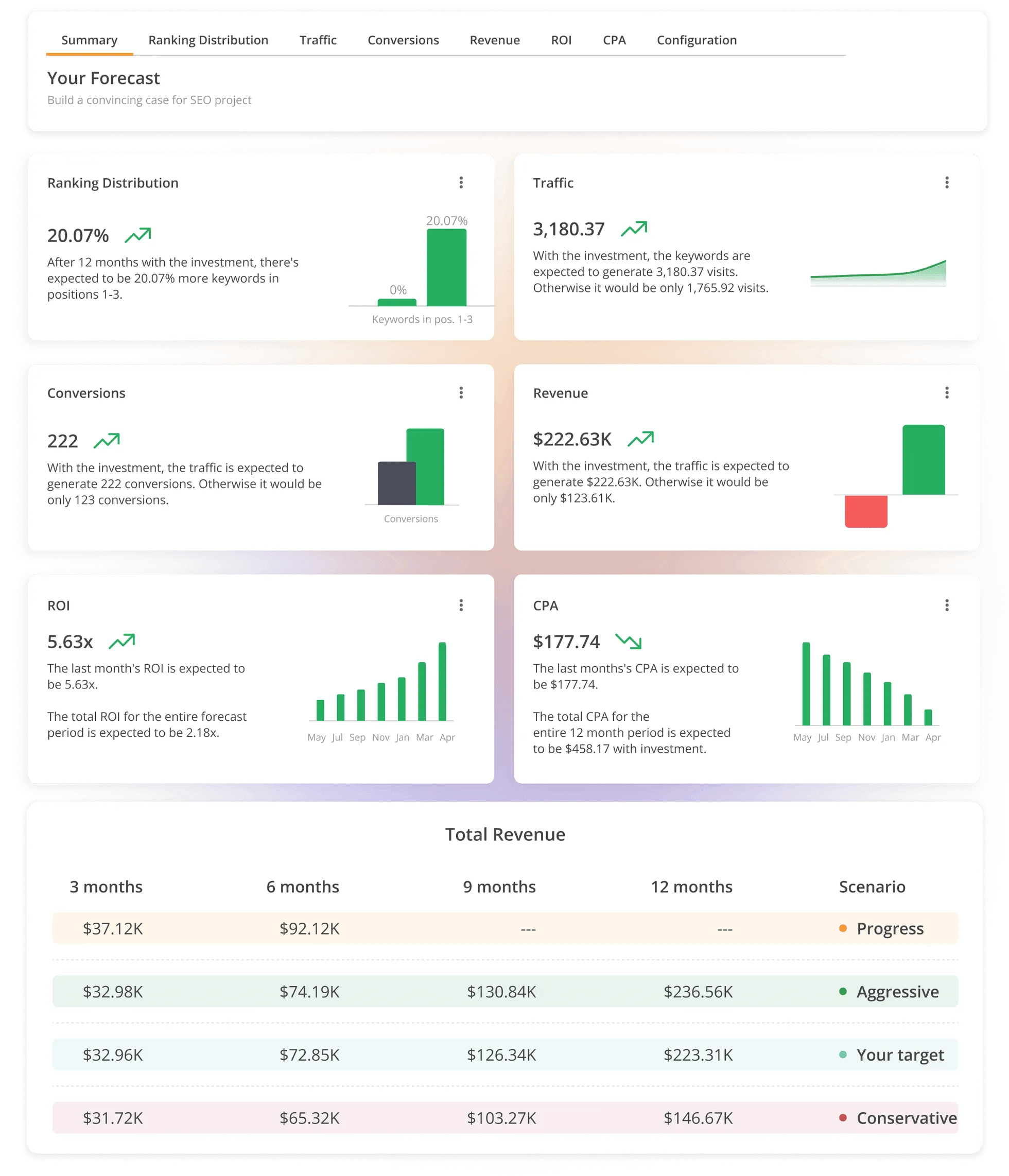 Tailor your forecast by setting your monthly investment, average conversion value, and average conversion rate. Add your preferred keywords, determine their rank targets, and understand the outcomes of aggressive or conservative scenarios.