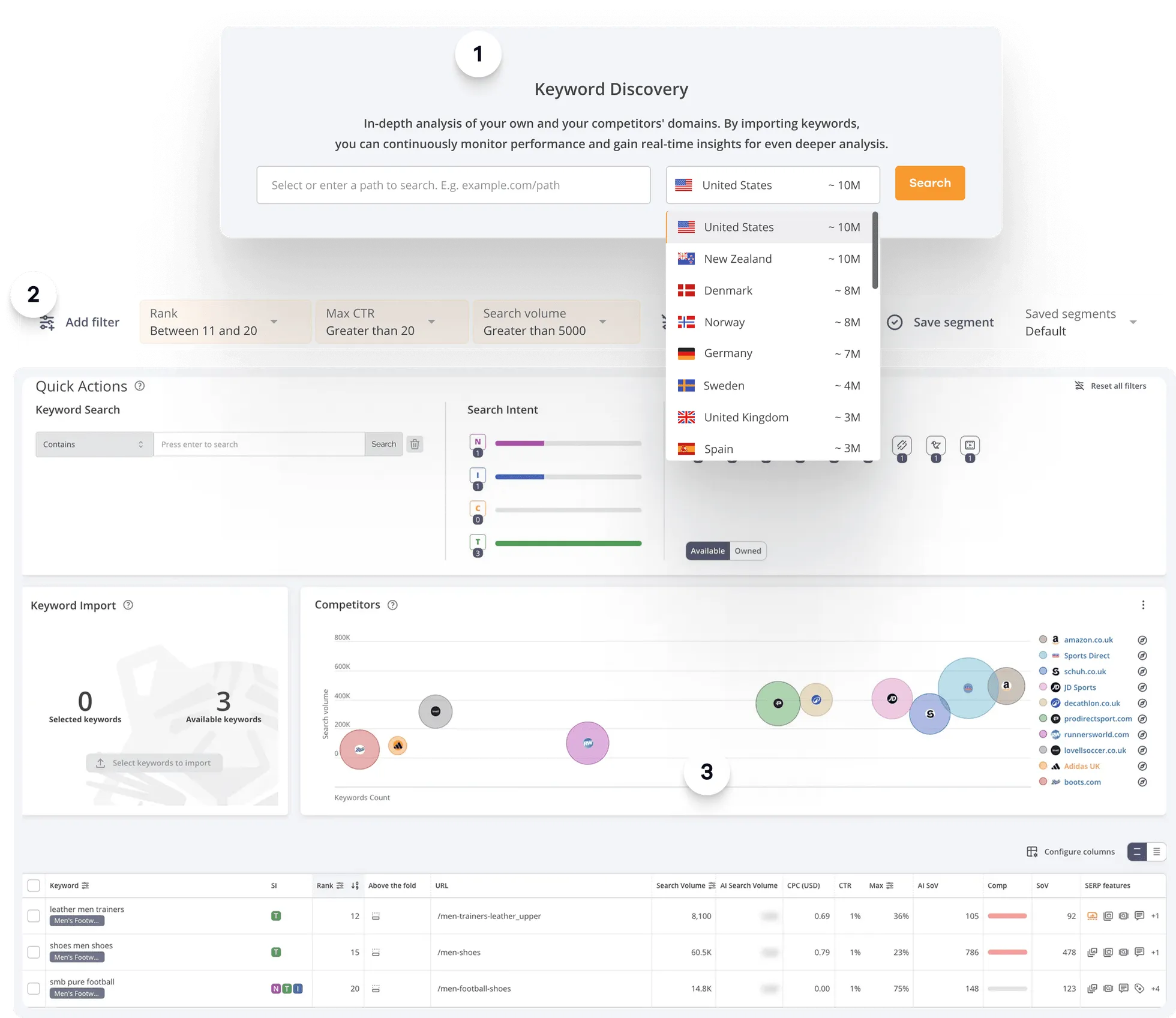 Discover and analyze keywords for any domainUnique competitor, keyword, and market insights are crucial to making informed SEO decisions and developing a winning SEO strategy. Use AccuRanker’s extensive keyword research database to get unparalleled insights into your domain’s performance across countries.