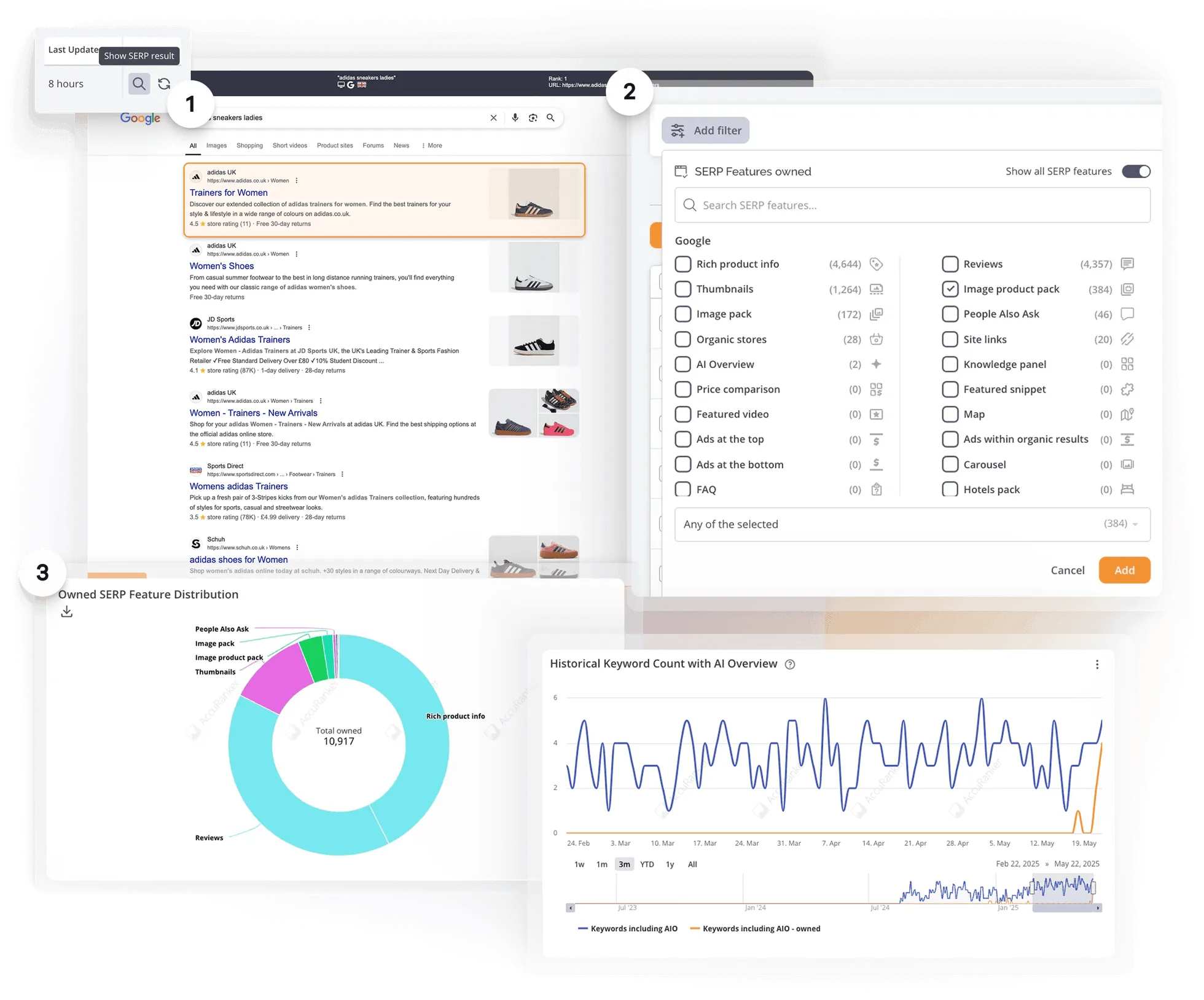 Track and analyze SERP features and the SERP landscapeAccuRanker enables SEOs to stay ahead of SERP changes by providing insights into evolving search features. Our tracking of AI Overviews and more than 45 additional SERP features allows you to monitor changes, spot trends, identify opportunities, and refine your SEO strategy.